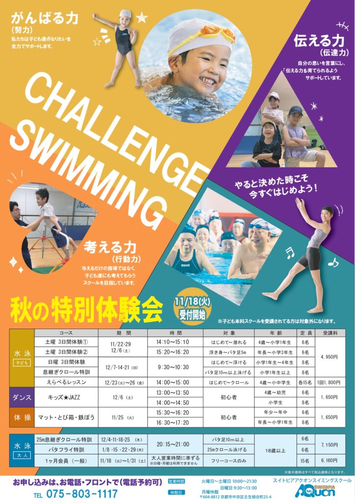 スポーツの秋!新しいことはじめませんか。アクオンではこどもから大人まで 『秋の特別体験会』を実施いたします。水泳・体操に加え、新たに「キッズ★JAZZ」も体験会の開催。ご参加お待ちしております。