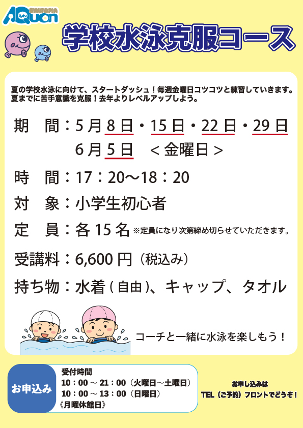 新学期がスタートしました。学校の水泳教室が始まる前に、アクオンのプールで一足早く練習をはじめませんか? 5/8~6/5【全5回】毎週金曜日の練習です。